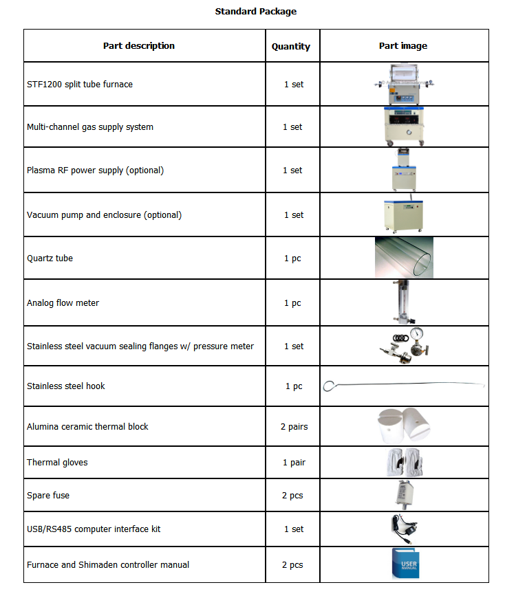 Furnace, vacuum pump and gas mixing system specifications