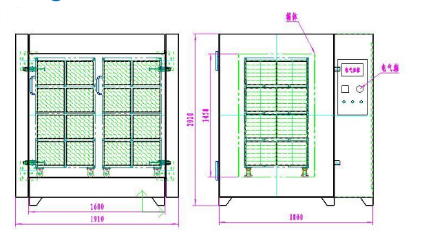 The two-way door opening mode is adopted. The battery or electric coil core or battery pole piece materials can be entered from one end and removed from the other end. One box can accommodate two battery racks at the same time, with large production capacity and convenient use; |