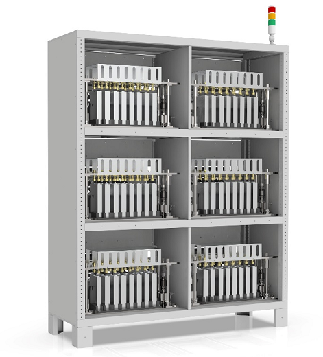 The rail lift car sends the fixture group → pushes the fixture group into the needle bed → starts the needle bed → starts the negative pressure process and charges the formation → the formation is completed → automatically opens the needle bed fixture → the rail lift car manually withdraws the fixture group → the next round of fixture group charging formation