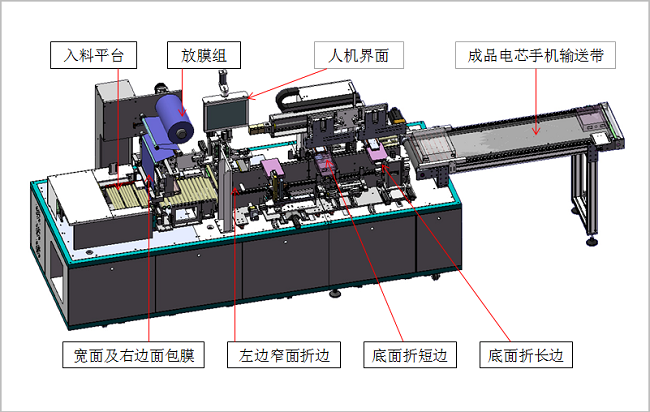 The servo push electric core is adopted, and the film drawing, coating and cutting actions are completed through the air cylinder + servo and precision mechanism to realize wide and narrow bread blue film.