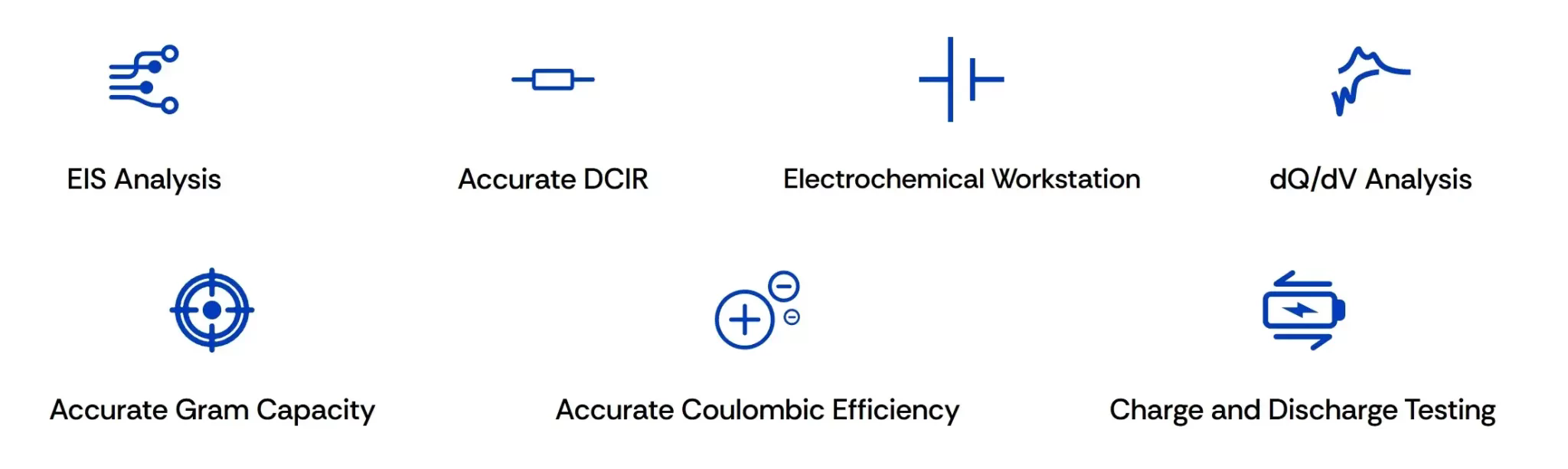 2) Supports a wide range of cell types, capacitor materials, half-cell, three-electrode, coin cell, and small-capacity testing.