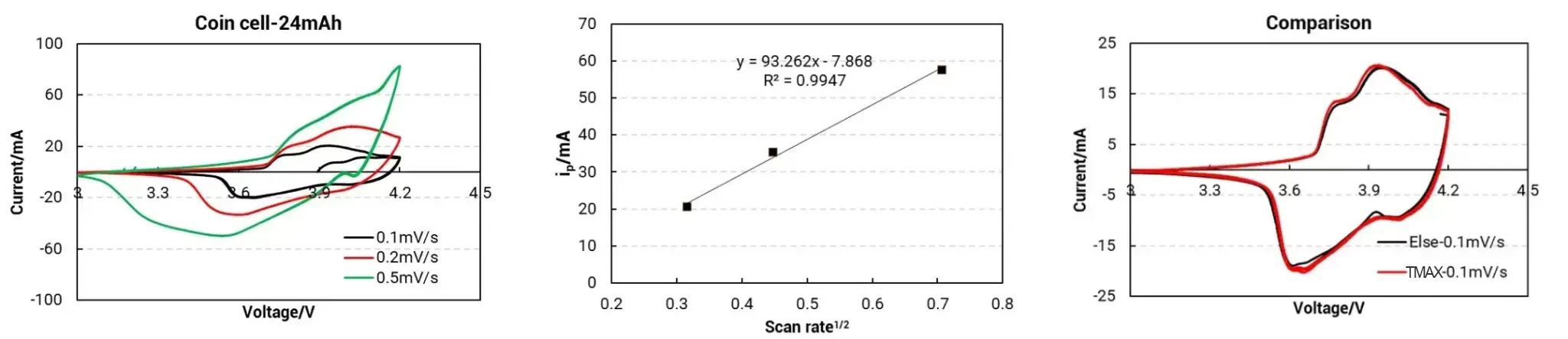 5) Supports electrochemical testing methods such as multi-scan rate cyclic voltammetry, linear sweep voltammetry, GITT, PITT, CA, and CP.