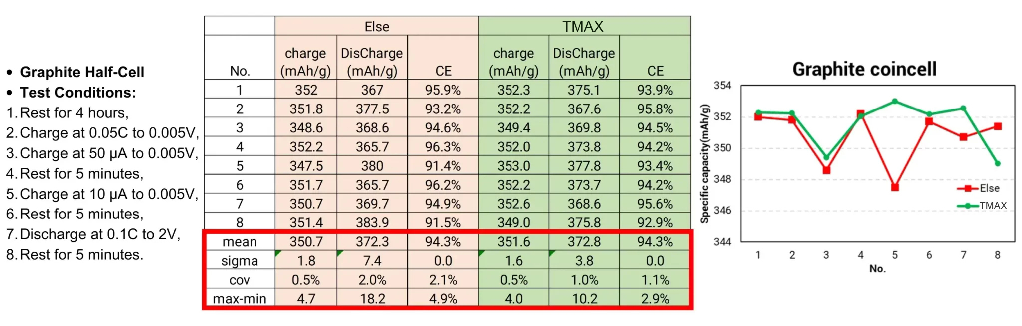 Gravimetric capacity tests were conducted on eight graphite half-cells, demonstrating better consistency in specific capacity!