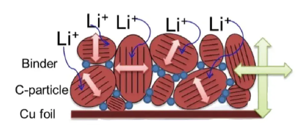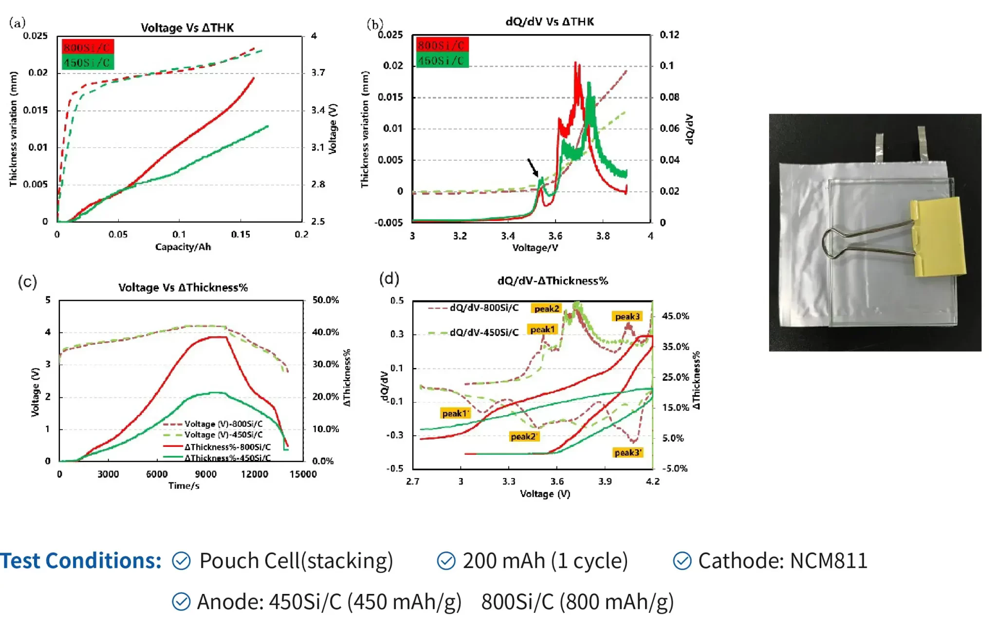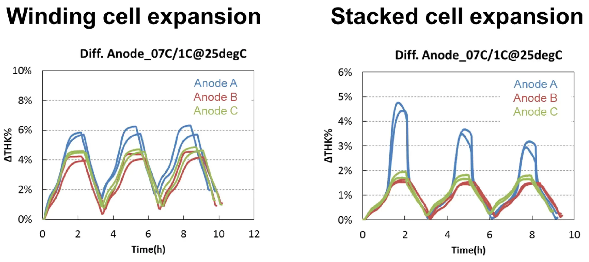 The higher the silicon content in the anode, the greater the swelling is (Max thickness change is around 40%), and the silicon-lithium alloy formed will affect graphite’s phase transition potential of lithium intercalation.