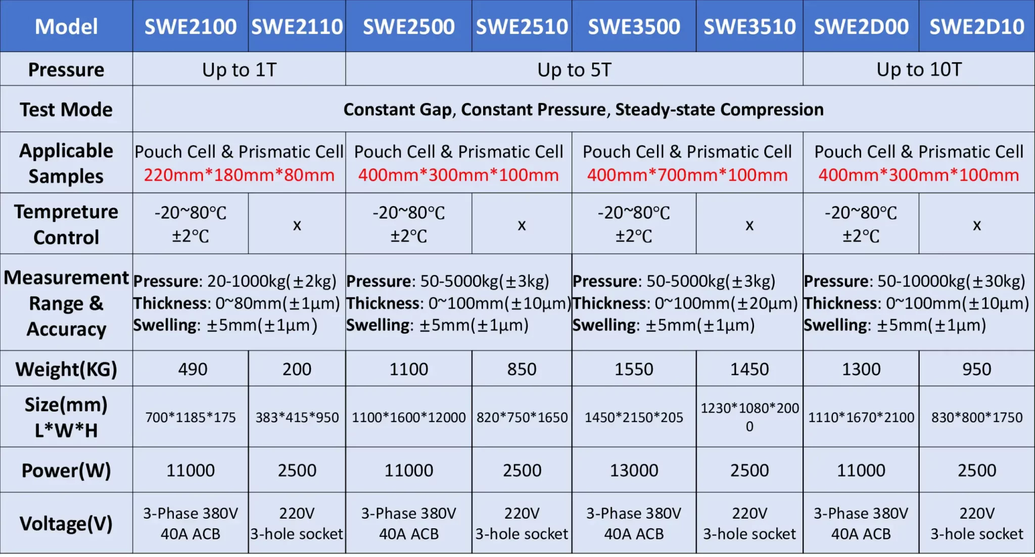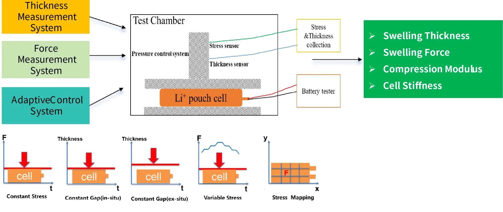 In-Situ Cell Swelling Testing System(SWE) adopts servo motor, combined with high-precision control system, equipped with multiple high-precision thickness measuring sensors, to accurately measure the expansion thickness and expansion force of the battery charging and discharging process.