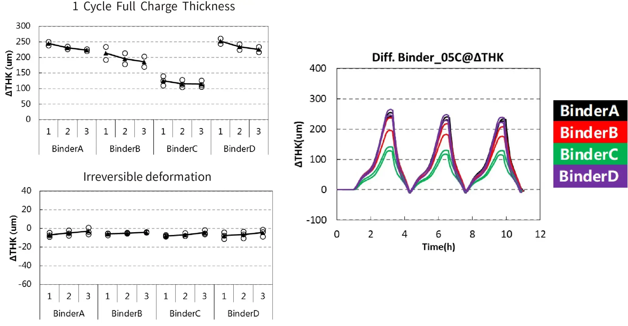 The irreversible swelling of the 4 tested cells is similar, and the main difference lies in the swelling thickness after one cycle of full charge, that cells with binder C outperformed the others.