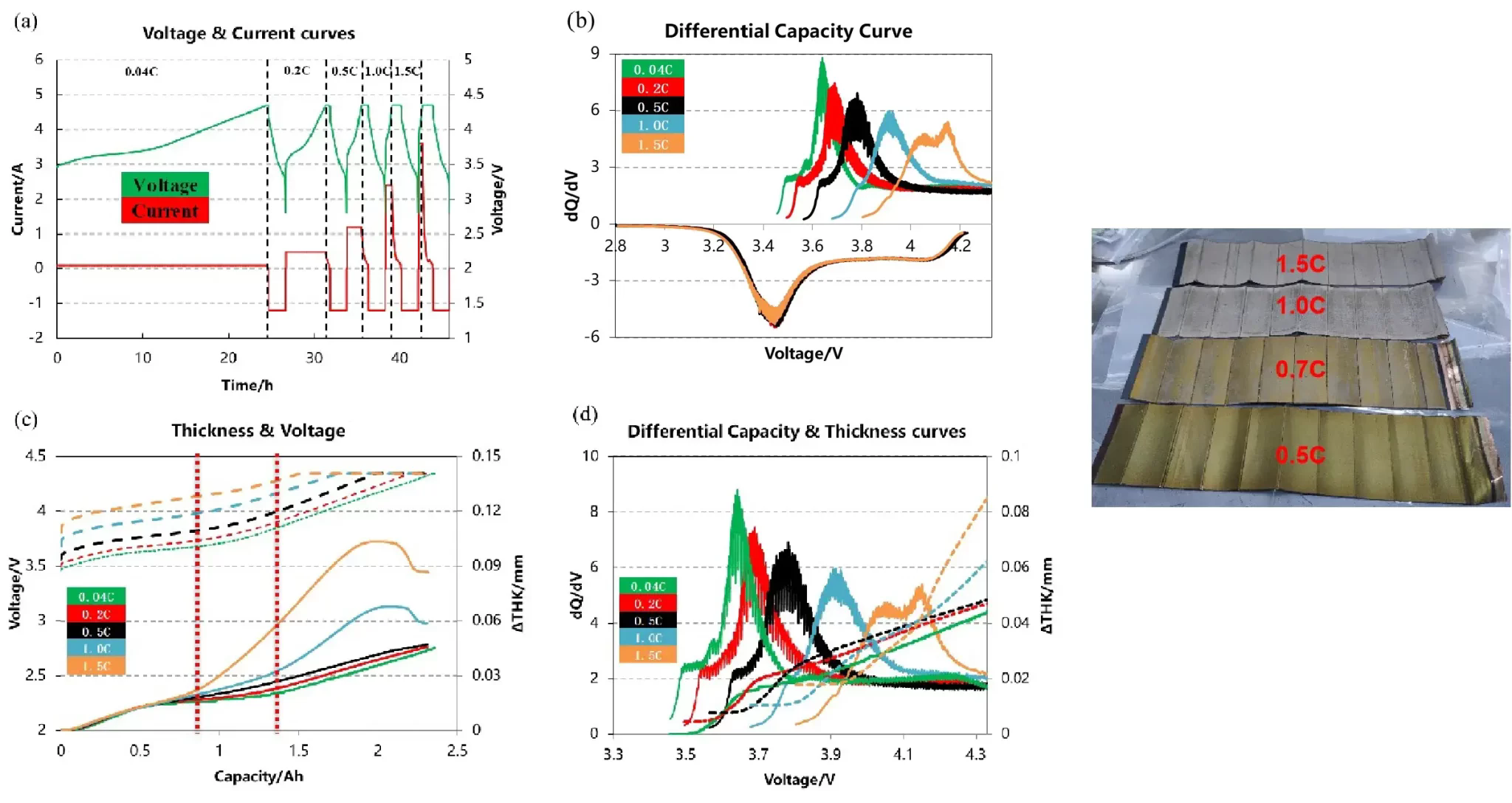 Test method: Charge the cells at different rates and discharge them at the same rate to analyze the differences in their voltage curves and swelling thickness curves.