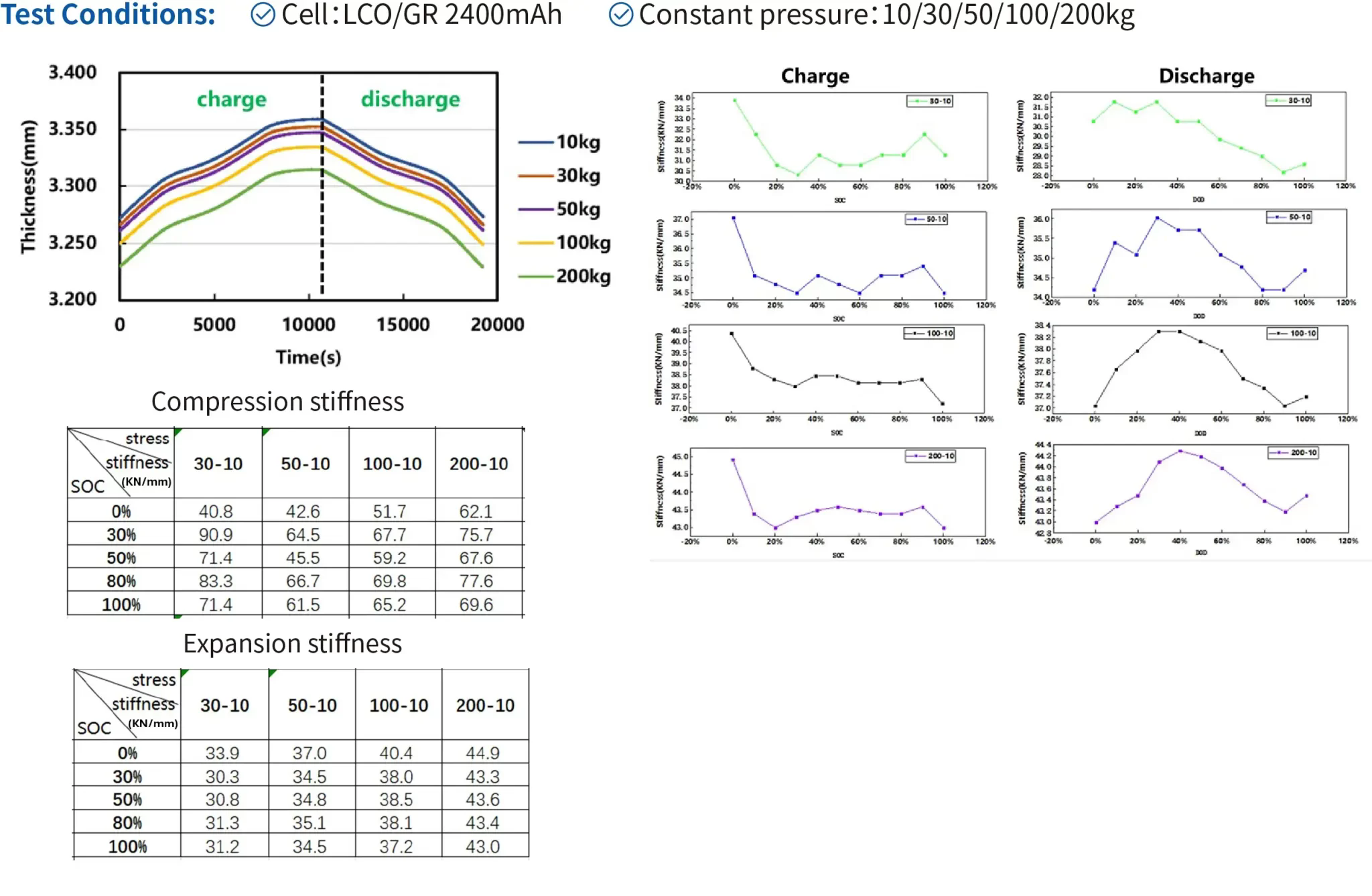 6. Quantitative battery cell swelling thickness and expansion force changes to assist in the study of battery cell swelling behavior;