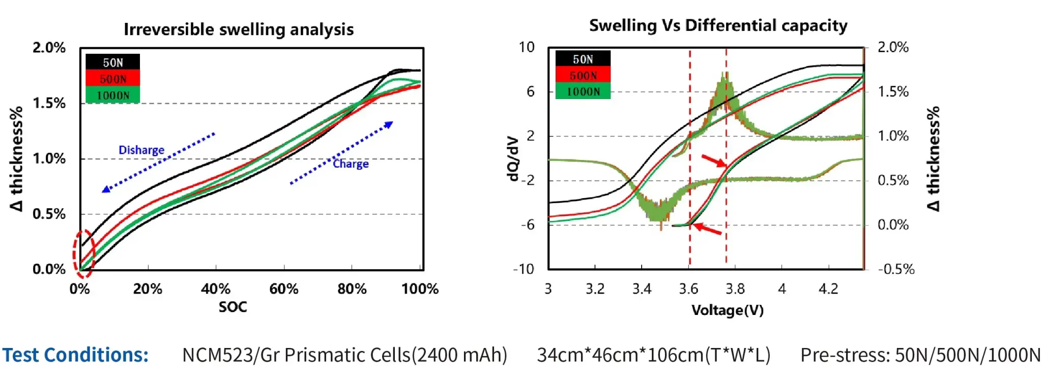 2) During the charge process, the 2 inflection points of the swelling curve correspond to the 2 peaks of the diferential capacity curve, indicating that the swelling of the cell is related to the phase transition of lithium intercalation & deintercalation.