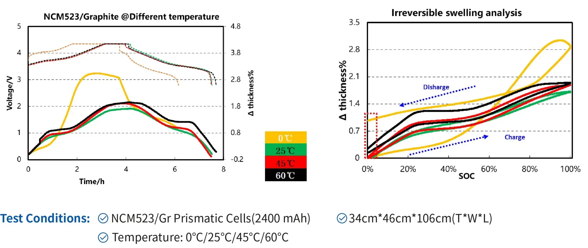 Test method: In-situ detect the thickness curves of batteries with different temperatures.