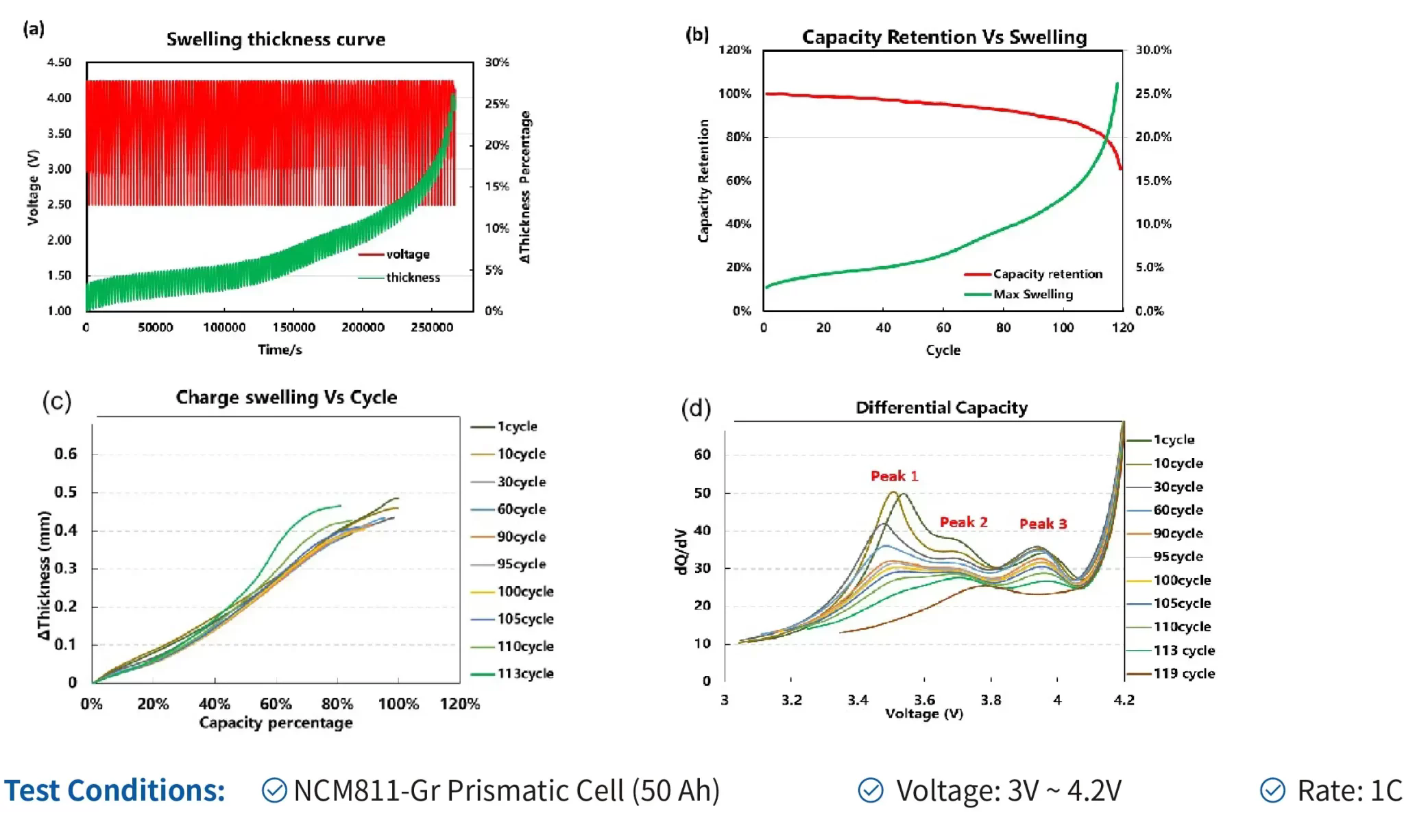 During the charging and discharging process of lithum-ion batteries(LIBs) as lithium ions are intercalated ordeintercalated into the electrodes, the LIBs will expandand contract. Ideally, the intercalation and deintercalation of lithium ions are reversible, but in the actual cycle process, there is always a part of lithium ions that cannot be extracted from the electrodes or deposits on the surface of the anode as an insoluble by product during the cycle, resulting in irreversible swelling of or other more serious consequences, such as the deformation of the LIBs, the fragmentation of material particles, the rupture of the solid electrolyte interphase(SEI), and the consumption of electrolyte. Thus the swelling behavior of the LIB becomes an impotant indicator for evaluating the reliability of the battery. During the production process, the particle size, binder and must be optimized in advance. For the next generation anode materials with higher energy density such as silicon and lithium metal theswelling ratios ot these materials are much greater than that of the graphite anode. Therefore. how to accu.rately and effectively evaluate the swelling behavior of the LIBs made by these new anode materials becomes more important, which can guide the design of the LIB pack and improve the space utilizatior under the premise of safety.