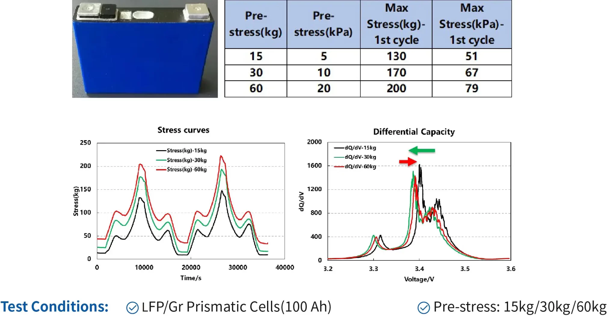2) The charge polarization of the cells first decreases and then increases with the increase of prestress, indicating that a pre-stress ofaround 30kg is beneficial for improving the rate performance of prismatic cells.
