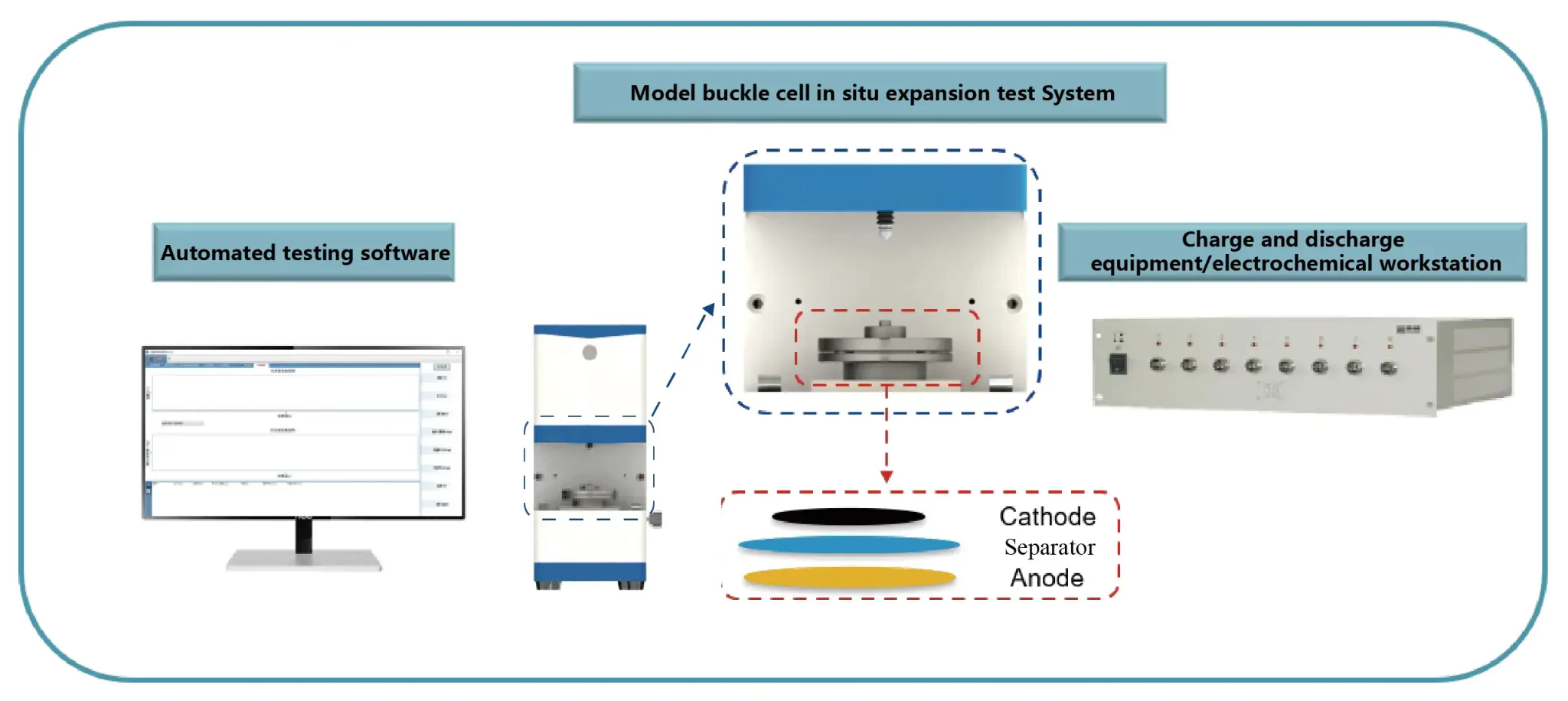 The Model Coin-Cell In-Situ Swelling Testing System using high-precision displacement sensors and high-stability structural systems, the swelling thickness change curve of the model coin-cell battery is tested in-situ, the swelling performance of the active material is quickly analyzed, and material development is facilitated.