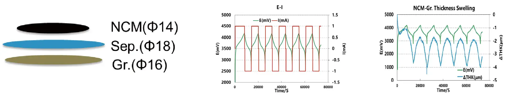 Assemble the NCM-Graphite LIB to test the thickness change during charge and discharge; test parameters: the current density is 0.6 mA /c㎡, 2.8~4.2V;