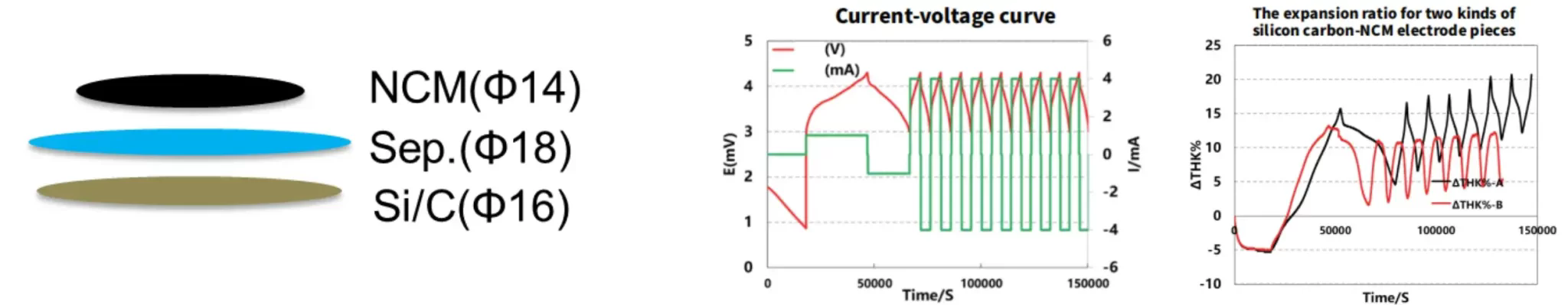 Assemble NCM-Si/C LIB and test the thickness change during charge and discharge; test parameters:current density is 0.6 mA/c㎡, 3~4.3V;
