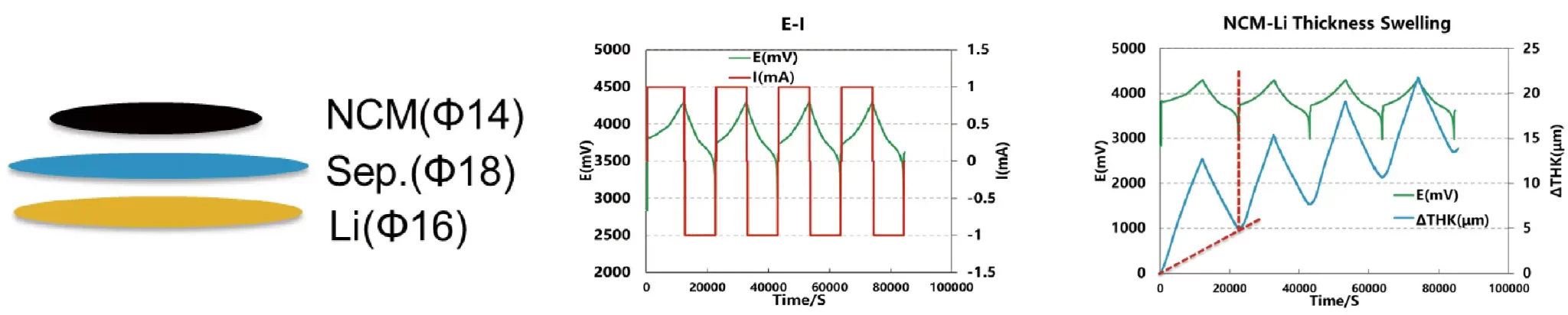 Assemble the NCM-Li half cell to test the thickness change during charing and discharging; test parameters: the current density is 0.6mA / c㎡, 3~4.3V;