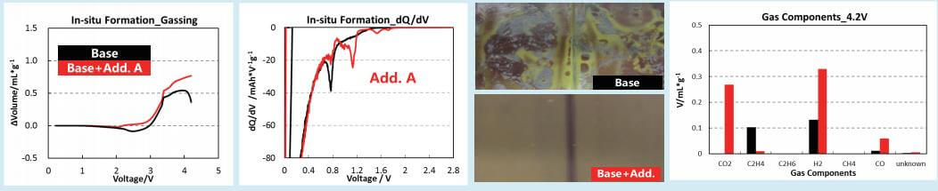 Comparing the overcharge gassing behavior of lithium-ion cell with two different types and contents of additives, it can be found that the reaction potential of additive-A is lower than that of additive-B, and the total gassing is lower a little more, it can be better used as overcharge protection additive.