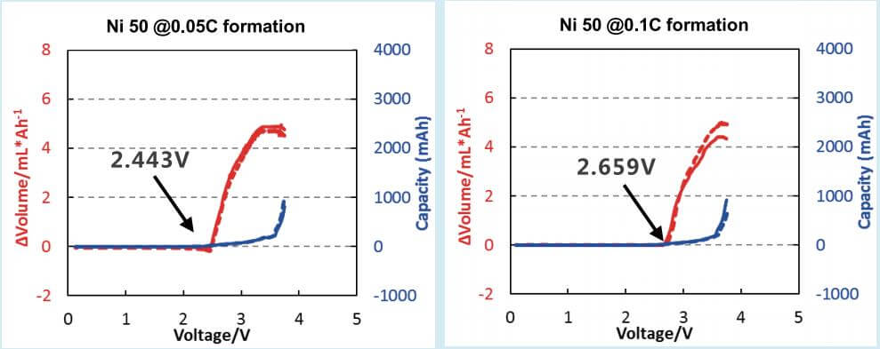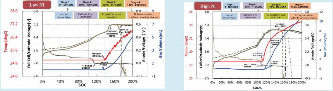 Comparing the cell SOC during gas production, it can be found that the high nickel cell produces gas earlier;