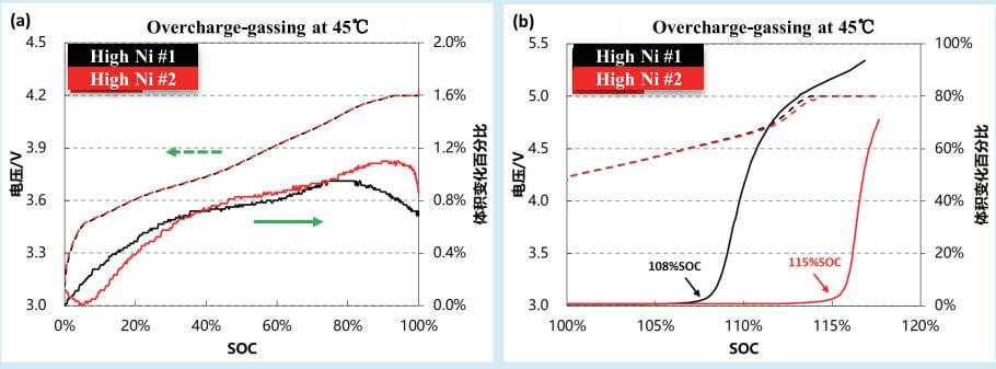 *In the normal voltage range, the volume change of the cell is less than 1.2%, which is basically due to the structural swelling caused by lithium intercalation. When the SOC of high Ni-2 is greater than 40%, the structural swelling of high Ni-1 is slightly greater than that of high Ni-2;