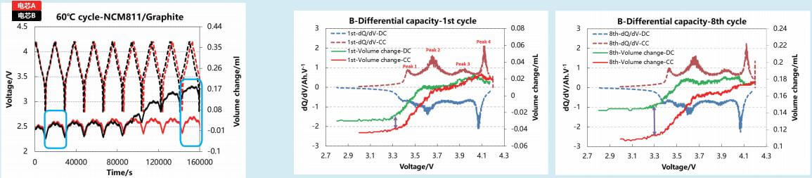 *Cell A and Cell B were used different ternary materials, the cell volume of cell-B increased more than that of cell A, and the irreversible volume increased from 0.01 ml to 0.04 ml;