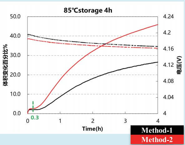 The results show that the voltage drop of NCM811 in modified method-1 is larger than that in modified mothod-2 at 85 °C, and the gas production is more ;