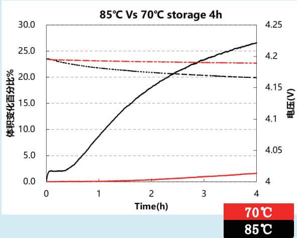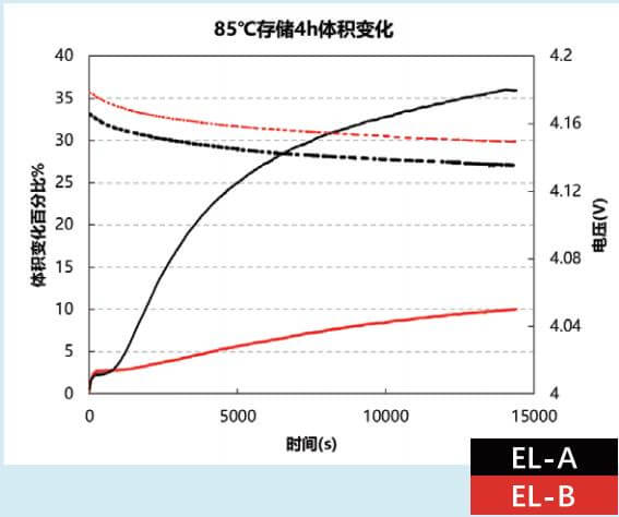 *A and B of cells adopt different electrolyte systems. From the cell volume change curve during full charge storage, it can be seen that EL-A cells produce more gas than EL-B cells, which indicates that the electrolyte of system is easy to produce gas under high temperature and high pressure;