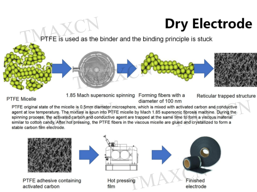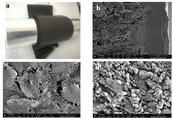 (d) SEM of PTFE fibrosis on the surface of graphite dry electrode