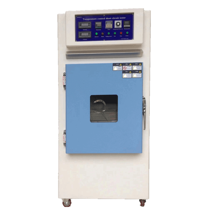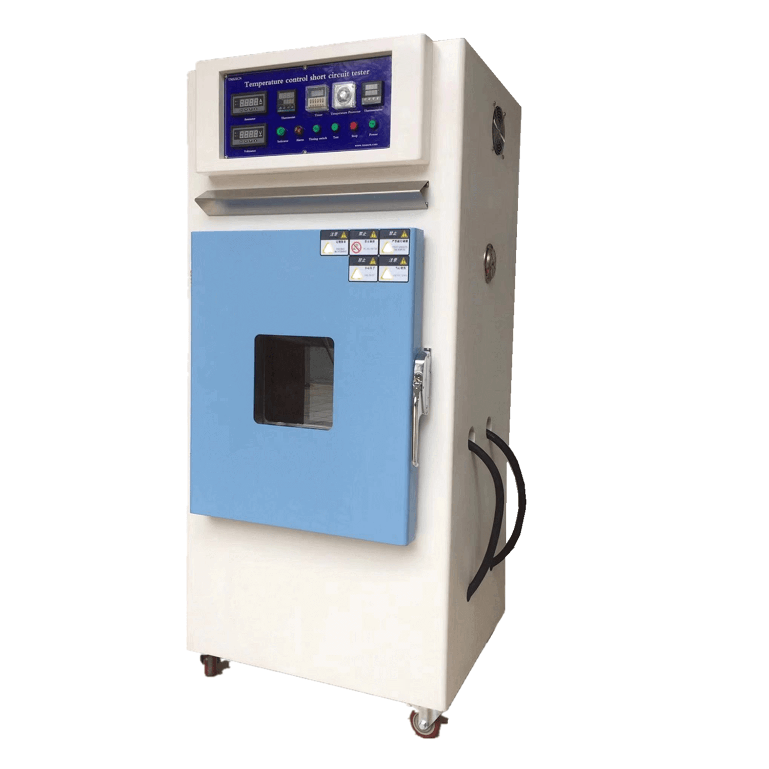 The short circuit tester adopts PID automatic control to simulate the external short circuit of the battery, meeting the standards of UL1642,UN38.3,IEC62133,GB/T18287,GB/T 31241-2014, etc. The red copper contactor is used as the switch element and the thermal relay as the protection device. When the circuit breaker is closed, the circuit of the tested battery is short circuited, and the strong short-circuit current passes through the whole circuit. After data processing, the battery surface temperature, voltage and current signals detected by Hall element are sent to the computer side, and the software continuously records the battery voltage, current and surface temperature changes. The short circuit tester must conform to the resistance of the whole circuit (including circuit breaker, wire and connecting device) of 80 ± 20 m Ω, and each circuit can withstand the short circuit current with a peak value of 1000A/2000A.