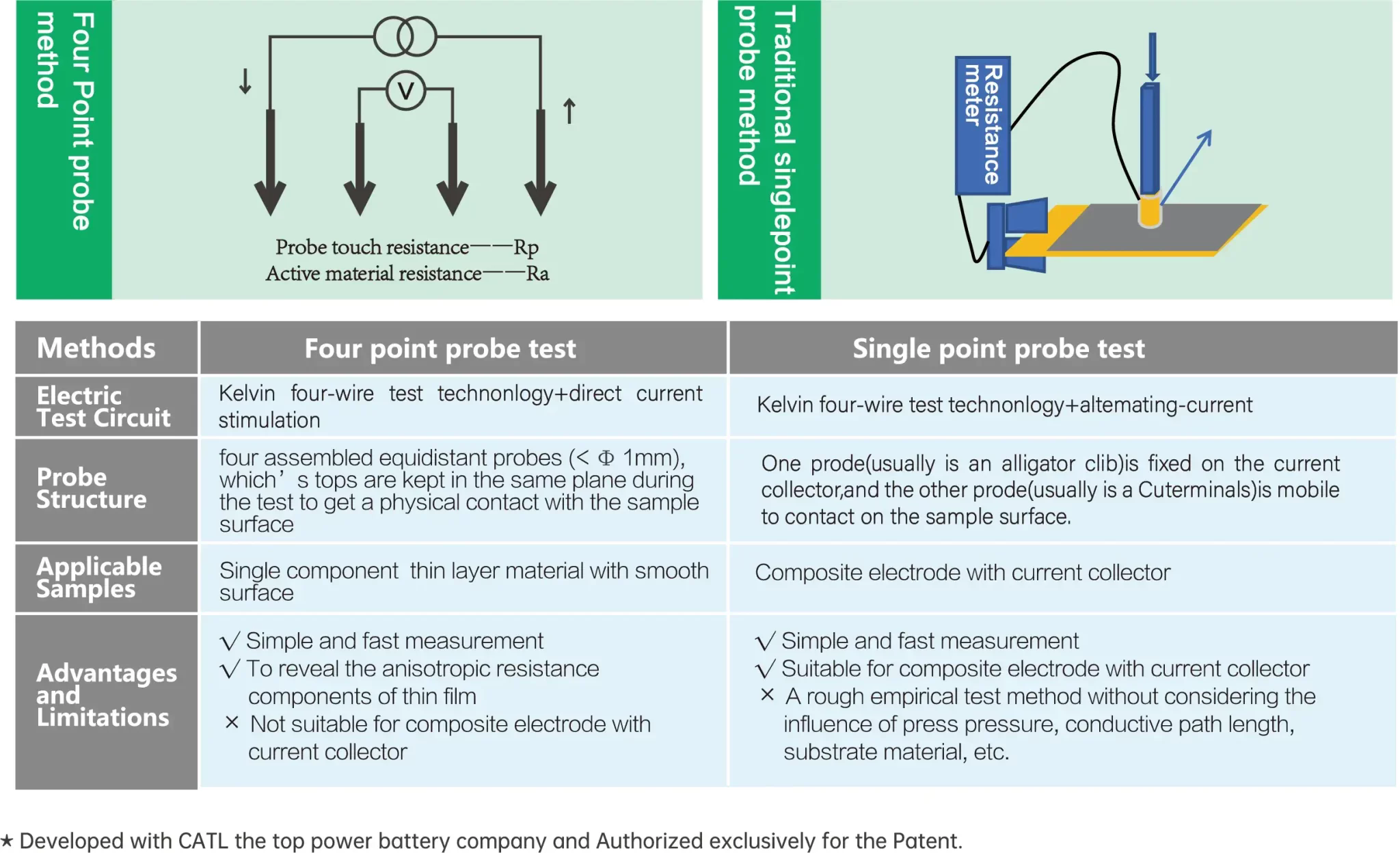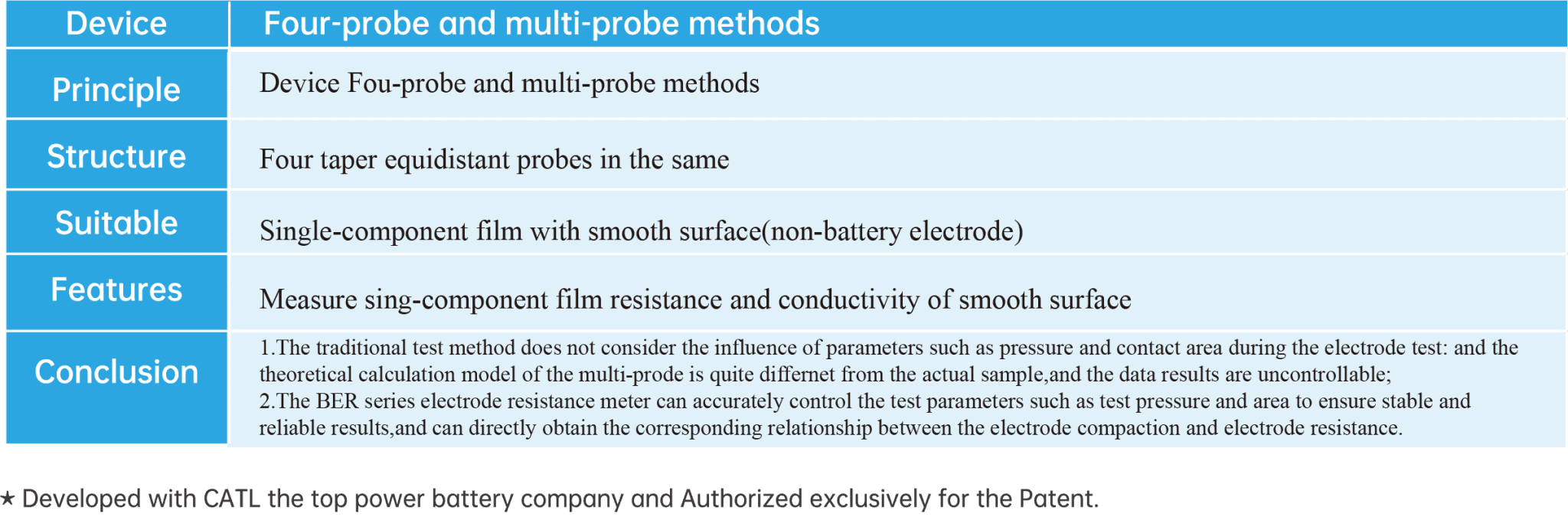 Currently, there are several methods have been used to test the electrode resistance, such as four point probe method or multi point probe method and single point probe method. Though these traditional methods may have been maturely used in di&rent types of film industry areas, for the evaluation of the composite electrode films in lithium ion batteries, there are still several deficiencies that can not be ignored.