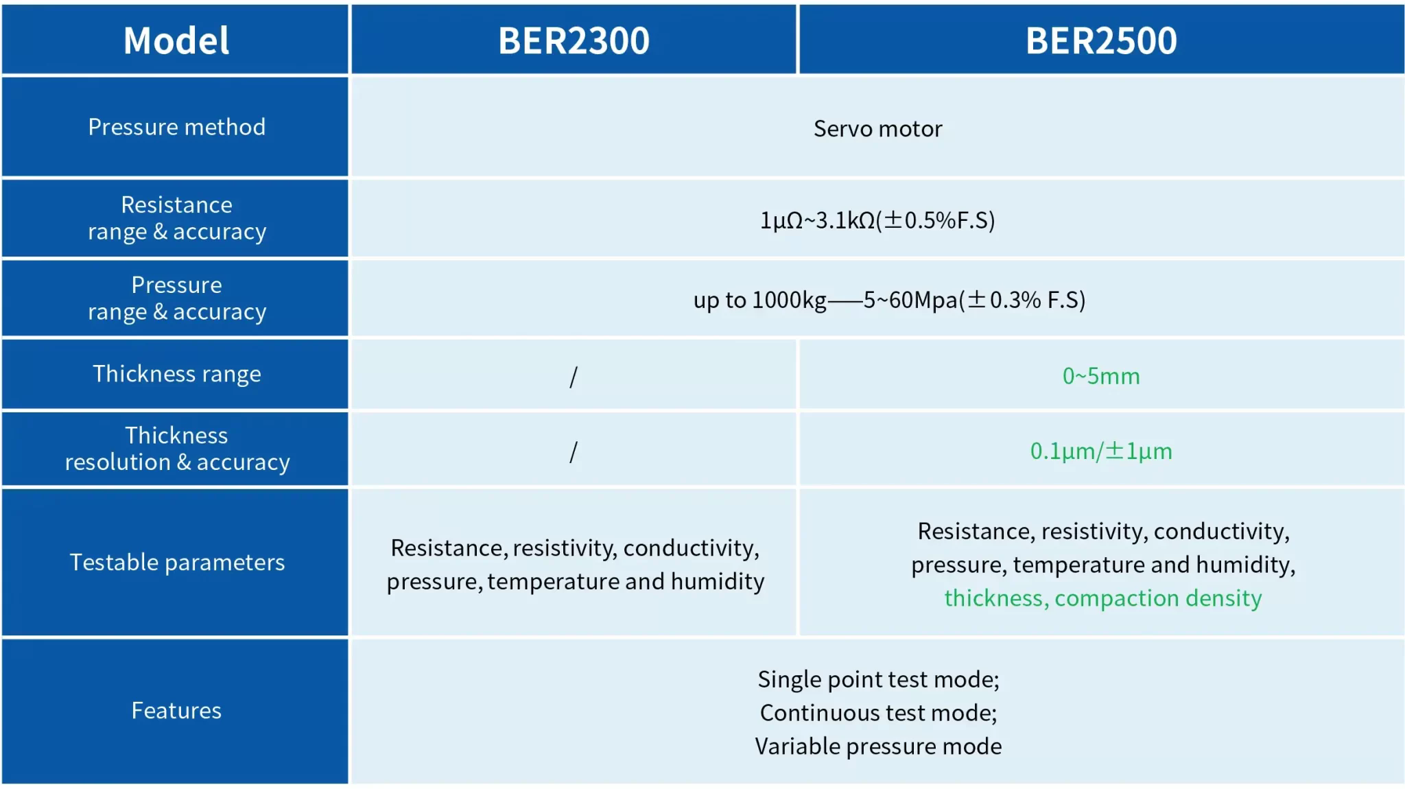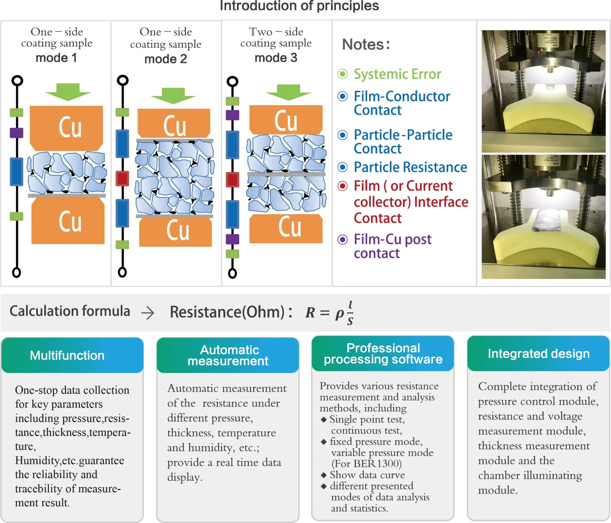 The Battery Electrode Resistance Analyzer(BER series) adopts the double-plane pressure-controllabledisk electrode to directly measure the overall resistivity of the real electrode, that is, the sum of the coating resistancethe contact resistance between the coating layer and current collector and the current collector resistance.