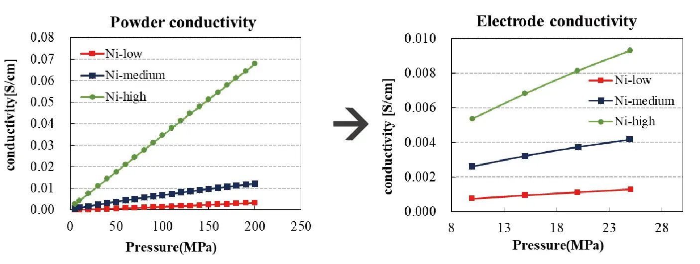 1) Adjust the Ni content in the NCM material, and test the powder conductivity. It can be found that as the Ni content increases, the powder conductivity increases;