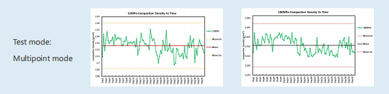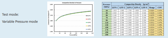 Result analysis: The COV of the compaction density of 5 groups under each pressure is less than 0.5%, and the data fluctuation range is less than 0.05g/cm3, indicating that the the repeatability of this equipmentis good.