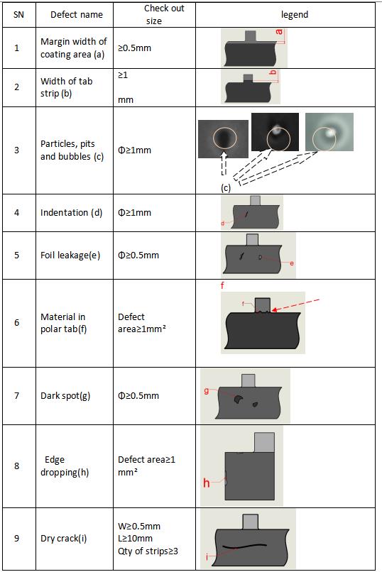Coating defects of standard lithium battery pole pieces such as exposed foil, dry material, dark spots, scratches, foreign matters, etc |