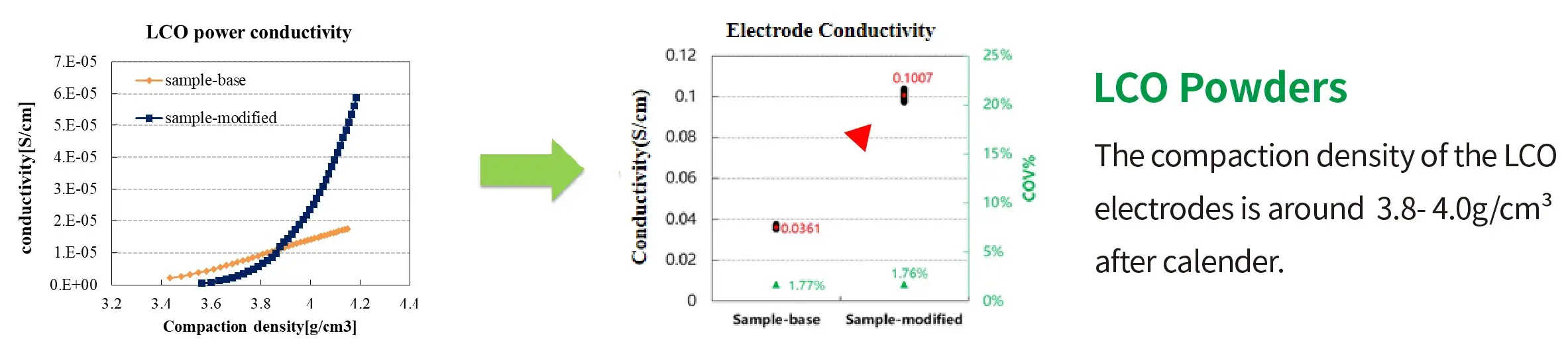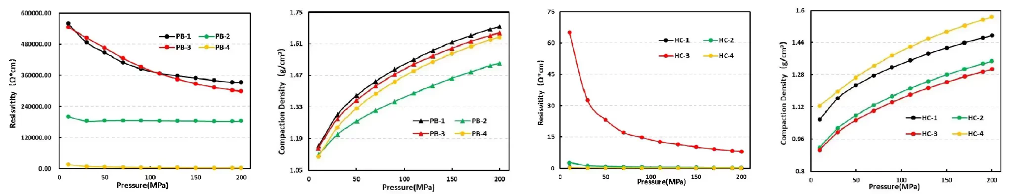 Using LCO powder as an example, when the compaction density ofthe modified powder sample is less thar3.87g/cm’ (pressure <75MPa), its conductivity is lower than that of the unmodified powder sample.However, when the compaction density exceeds 3.87g/cm’ (pressure>75MPa),the conductivity ofthe modified powder beeinsto surpass that of the unmodified powder, and the conductivity improves significantly as the compaction increases