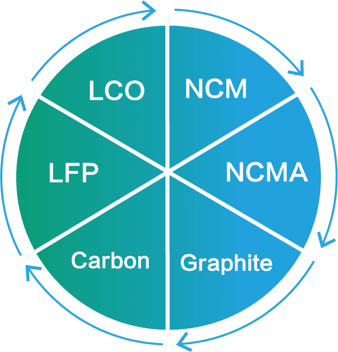 1. Lithium (sodium) positive and negative electrode powders (LCO/NCM/LFP/Graphite, etc.).