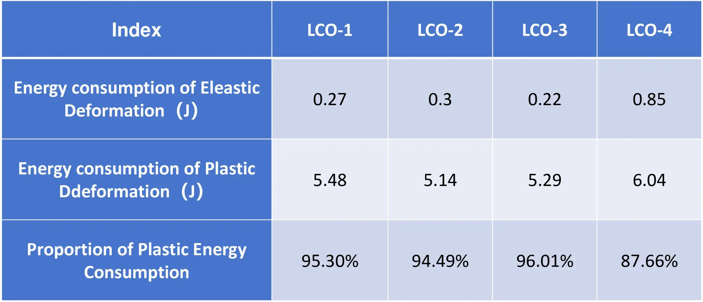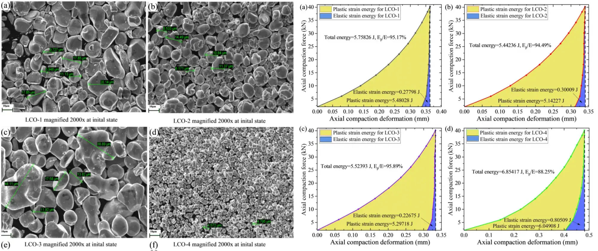 Powders of smaller particle size(LCO-4) exhibit a more noticeable reboundness, and its proportion of Plastic energy consumption is relatively lower as well.