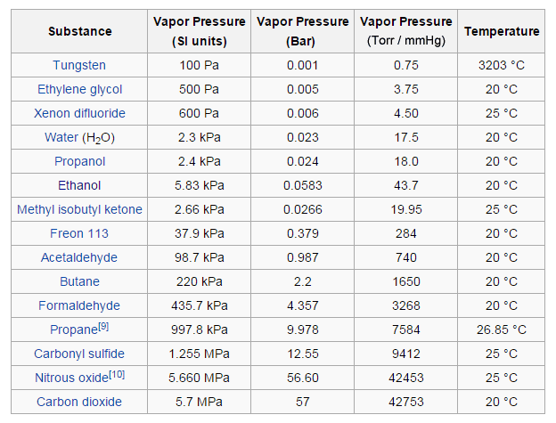 Example: The following table is a list of a variety of substances ordered by increasing vapor pressure (in absolute units).