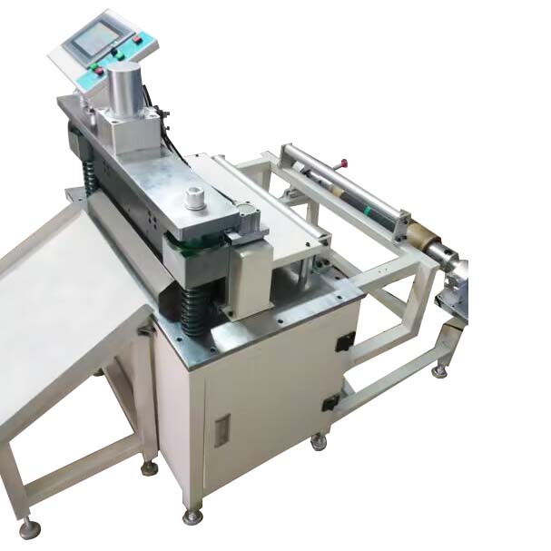 The machine unrolls the material using a tension controller and the stepping motor drives precision feed rollers to achieve fixed-length feeding. An imported high-accuracy color mark sensor ensures tracking and control for positioning and intermittent cutting, with the cylinder executing the cut.