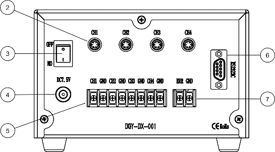 1. Touch screen 2, irradiation head interface 3, power switch 4, DC input 5, foot pedal and control terminal 6, RS232 interface DB9 7, light source alarm input